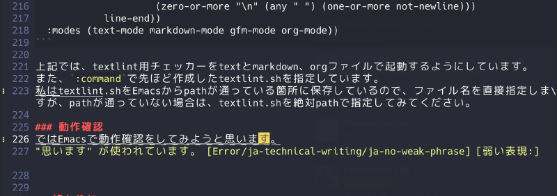 :modes (text-mode markdown-mode gfm-mode org-mode))上記では、textlint用チェッカーをtextとmarkdown、orgファイルで起動するようにしています。