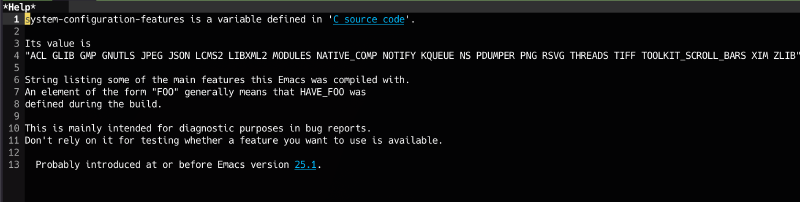 Emacsを起動してM-x describe-variable RET system-configuration-features RETを実行する。